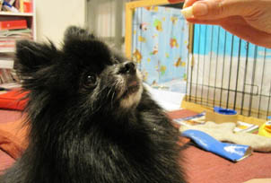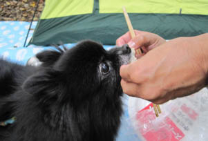 私たちがたまに目が赤くなるように、しでんくんもたまに目が赤くなっています。一年前、気がつかなくて、ひどくなってしまってから、お医者さんに連れて行ったところ、治療にだいぶ日数がかかってしまったので、それから気をつけて、たまに目をチェックしています。目薬はお医者さんでいただいておいて、目が赤いかなというときにさします。いい子でさしてもらって、あとでご褒美をいただきます。