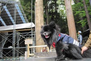 今年は諏訪大社の御柱祭がありました。当日は大変な人出で、しでんくんは行けませんでしたので、秋になってから御柱とご対面。一応、ハッピ、着ています。これが御神木かあ。下社の秋宮も春宮も、わんわんには寛大で、鳥居をくぐっても何も言われません。だから、しでんくん以外にもわんわんがお散歩していました。秋宮は今、工事中で、残念。せっかくの御柱祭が工事中で、お宮がパネルの写真なんてね。でも、しでん君はお宮がパネルでも、関係ないか。 |