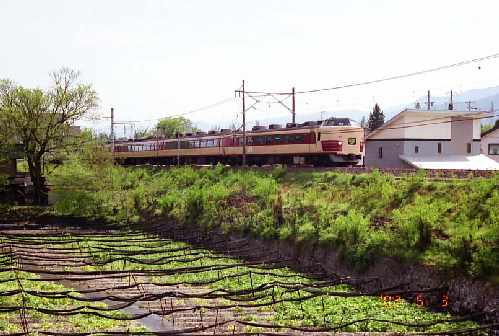 青々としたワサビ田を横目に、あずさが駆けぬける。 ワサビ田の青さと、汗ばむ陽気に、少し夏を感じた1日だった。